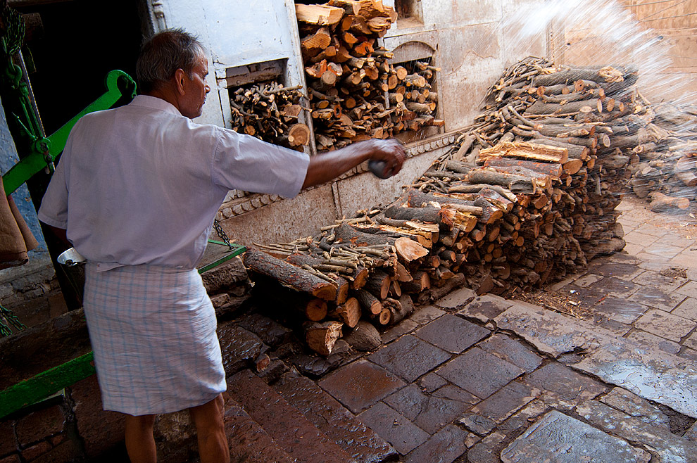 6. Varanasi, Manikarnika Ghat - sprzedawca w sklepie z drzewem (na potrzeby pogrzebów)